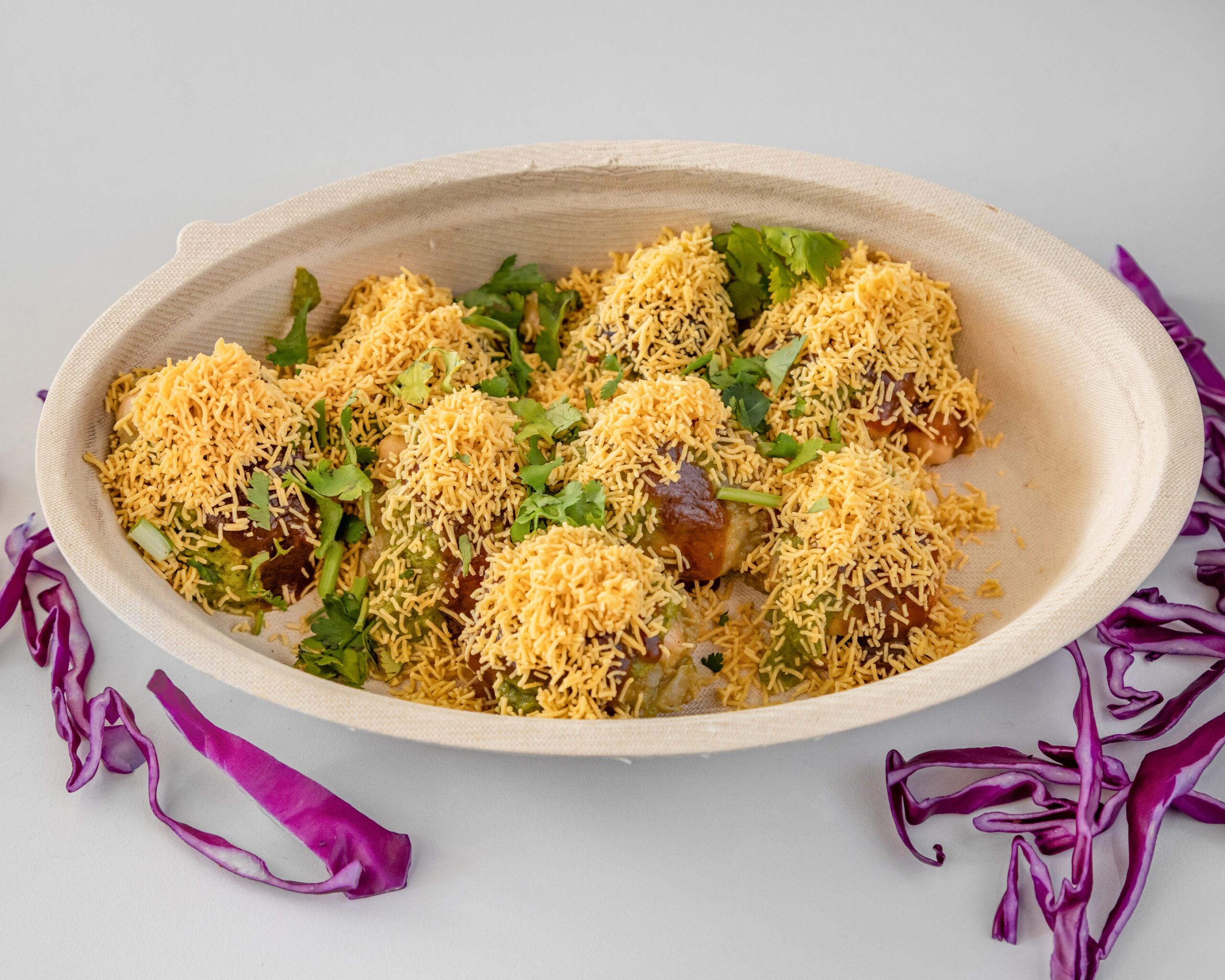 Crispy puris topped with tangy tamarind chutney, spicy potatoes, crunchy sev, and fresh veggies.